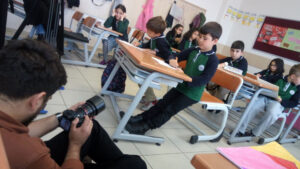 One day, in an art lesson the teacher walks around and views all of the pictures one by one. The teacher who has smiled all of the pictures gets sad when she sees the picture of Muhammed. She strokes Muhammed’s head like she says “Oh Allah”. Some of the students recognize that. In the break time, Muhammed’s deskmate opens Muhammed’s picture folder and sees the picture that he drew. Other students come near to the picture too. All of them look at the picture in sadness for a while. Then they pour their color pencils on the desk and start working. First they turn the combat plane on the sky into a blue cloud. Then they color the bombs and turn them into balloons. They add a balloon seller in this picture too. After repairing the devastated walls of the house, they finally add the final touch and turn the dead man on the ground into the shadow of the balloon seller by painting it black. They put this colorfully transformed picture in the folder of Muhammed. Muhammed opens his picture folder as he gets home. But first he doesn’t understand what is going on and by putting the colorful picture aside, he tries to find his own picture. But he can’t find anything. Then he looks at the picture carefully and realizes that it’s his picture which transformed by his friends. He can’t believe his own eyes. He smiles, smiles, smiles and sticks this picture in the middle of the other colorless, sad and pessimistic war pictures.
